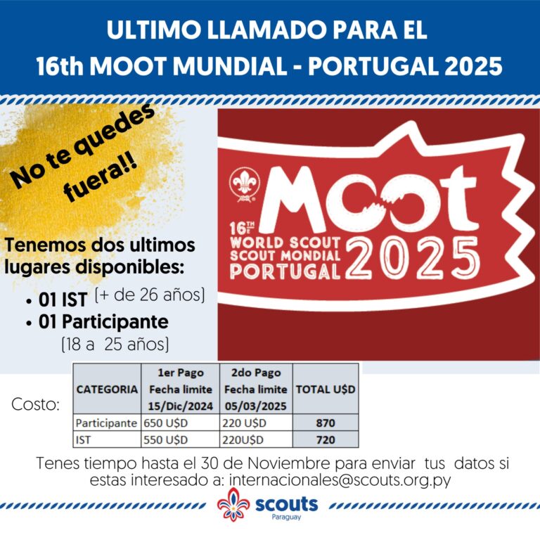 La Asociación de Scouts del Paraguay, informa que: quedan dos últimos lugares disponibles para el próximo Moot Mundial a realizarse…